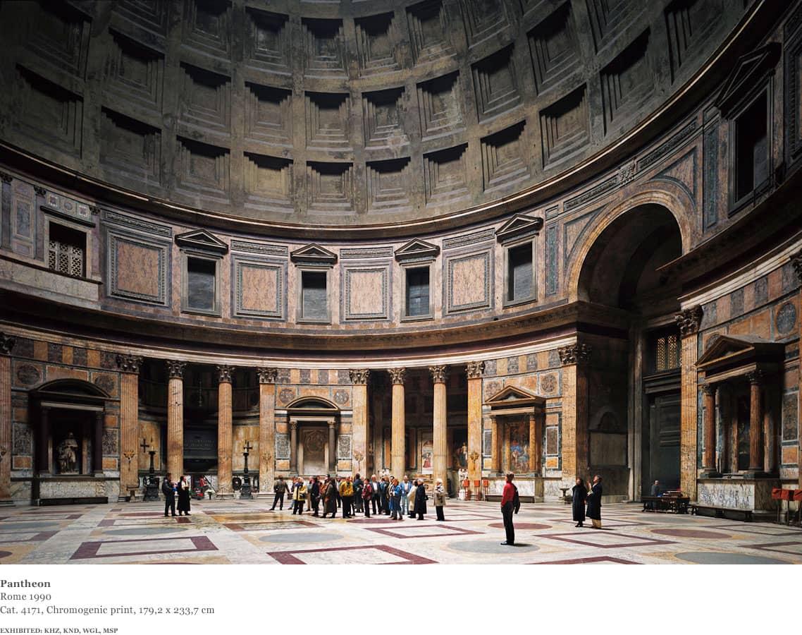 With the exception of a photograph from the Rijksmuseum with a friend of Struth’s sitting in front of a Rembrandt group portrait, the Museum Photographs were not staged. Struth preferred to observe and wait patiently for the work to form itself through the right configuration of people and pictures within the frame he had established in the gallery. Diverging from this working method was necessary for a work Struth wanted to make in the interior of the Pantheon in Rome. Struth first made a black-and-white picture in the Pantheon but the continuous movement of people and the limited light made it impossible to obtain a result.