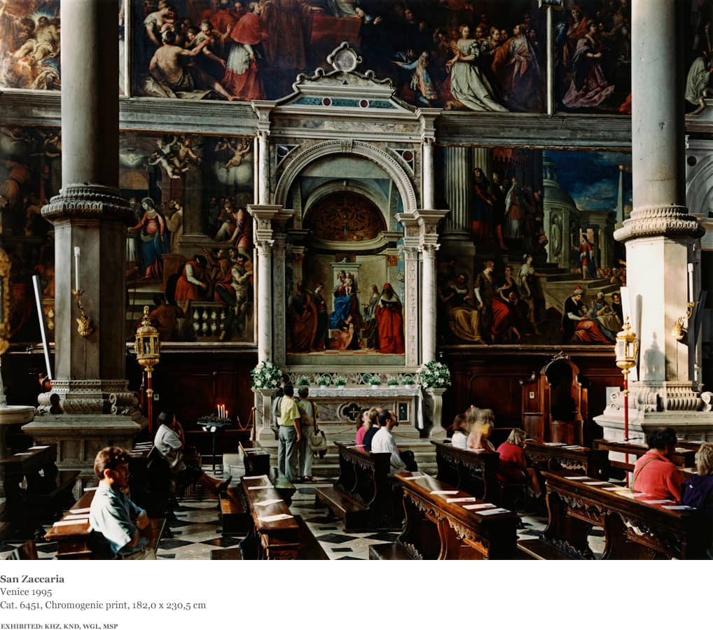 In San Zaccaria, Venice (1995) Struth constructed his composition around the central figures of the Madonna and Child in Giovanni Bellini’s Sacra Conversazione and included a number of visitors involved in different acts of looking, from aesthetic to religious contemplation. Struth had been introduced to Bellini’s painting by the Scottish art historian Giles Robertson, the subject of two of Struth’s earliest portraits.
