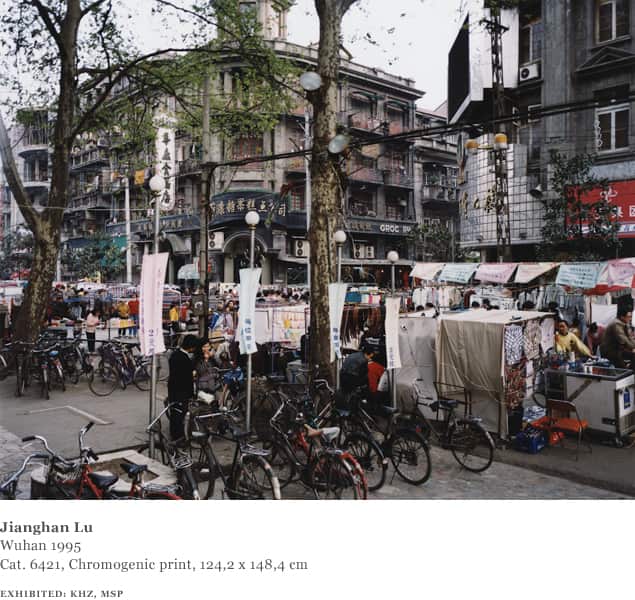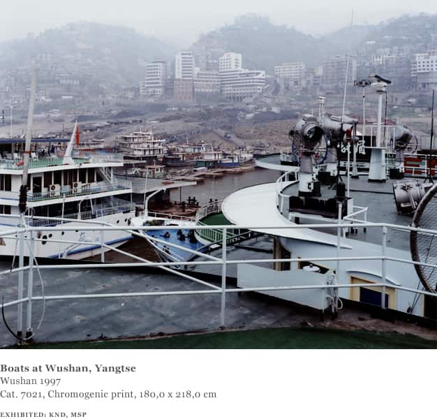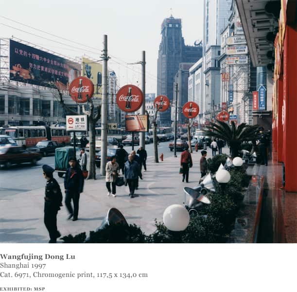 In total Struth visited China four times between 1995 and 2002. The group travelled to Beijing, Shanghai and Wuhan, as well as through famous landscapes such as the Yangtse River, the Gobi Desert and Inner Mongolia and saw factories, farms and pilgrimage sites. The photographs Struth took in China depict historic landscapes, busy city streets and in one instance — Tian An Men Square, Beijing (1997) — a place of national ideological and political importance.