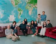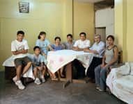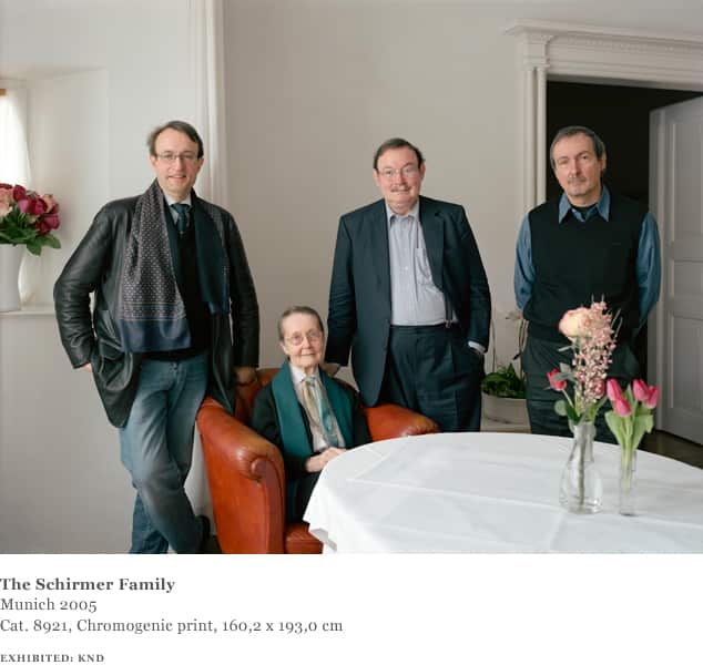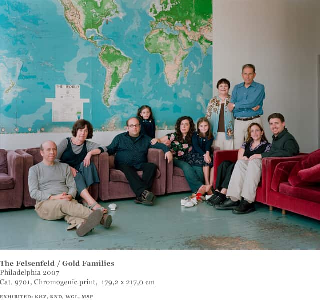 As in earlier family photographs, the interiors often integrate other pictures on the walls behind the sitting family— for example, the religious reproduction hanging on the wall above The Ayvar Family, Peru (2005); the paintings of a skull and a head of a young woman in The Richter Family 1, Cologne (2002); the Caillebotte painting in Untitled, New York (2001); or the large colour map of the world in The Felsenfeld/Gold Families, Philadelphia (2007).