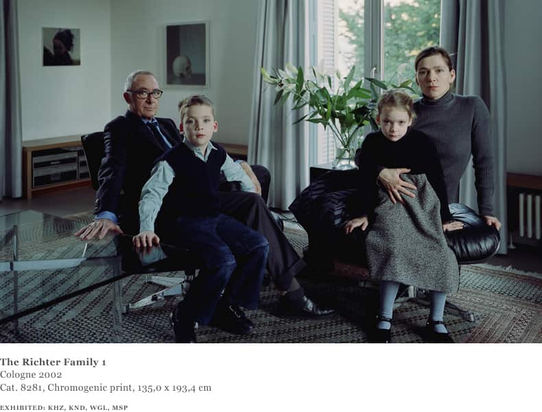 A different family photograph including the figure of a ‘master’, the artist Gerhard Richter with his family in Cologne in 2002, followed two individual portraits Struth had made of Richter in his studio in Cologne and sitting in a room of his paintings at the Museo Nacional Reina Sofia in Madrid in 1993. In the beginning of 2002, on the occasion of his retrospective at the Museum of Modern Art in New York, Richter asked Struth to make a family portrait accompanying an article about Richter’s work for The New York Times Magazine.