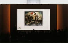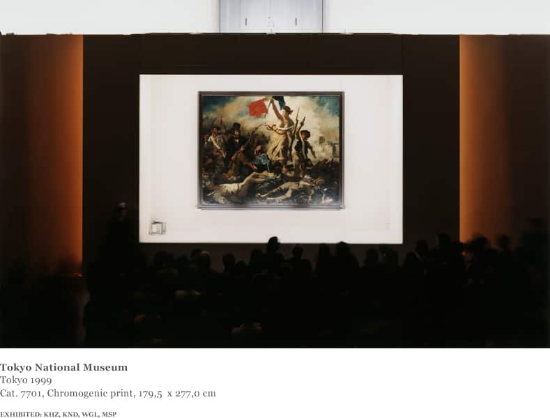 Following the completion of these photographs, he did not envisage returning to the theme of people in museums. But in 1999 he visited the exhibition of a single work by Delacroix, Liberty Leading the People (1830) at the National Museum of Art in Tokyo and was immediately struck by its unorthodox display. Risers had been built for the audience, who stood or sat in darkness as in a movie theatre; in place of the screen there was a brilliantly lit glass case containing the Delacroix painting. Struth decided to delay his return to Germany, obtained permission from the Louvre overnight, and went back to the museum the following day to make a photograph of this particular interaction of a contemporary crowd and a historic painting of ‘the people’. On the same visit to Tokyo, Struth also made a photograph of a single Japanese man looking at a display of historic Samurai swords in the same museum.