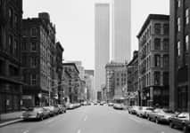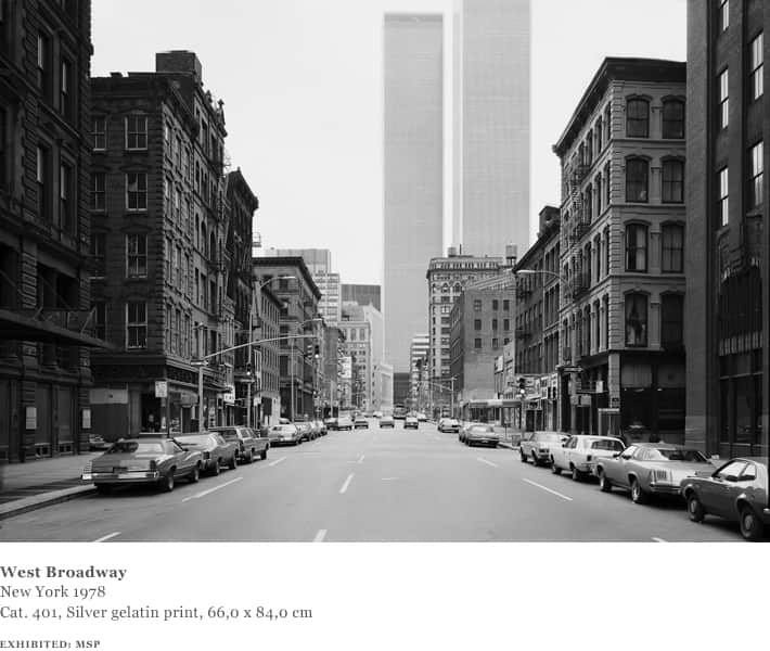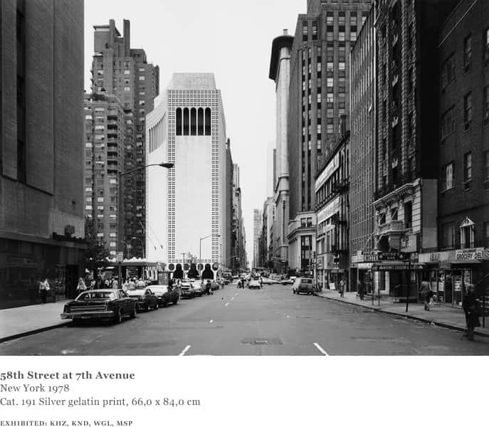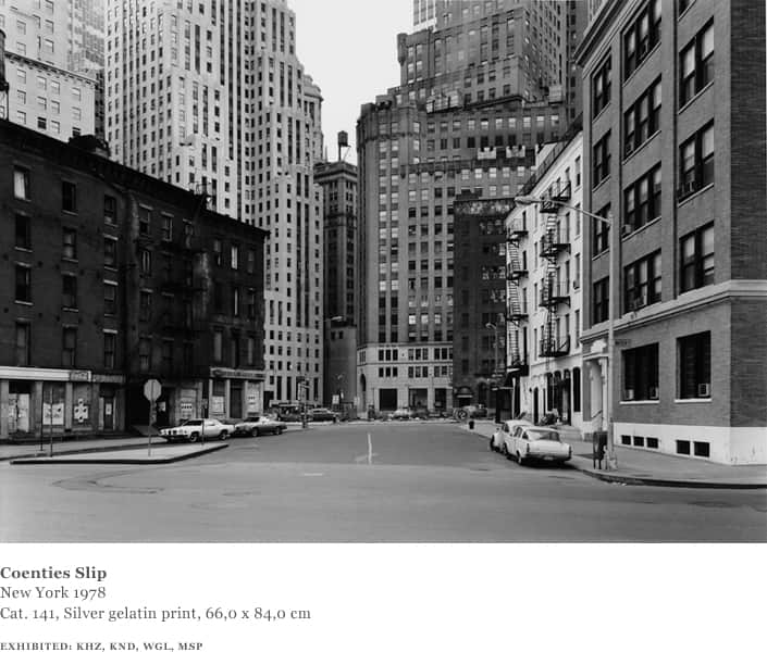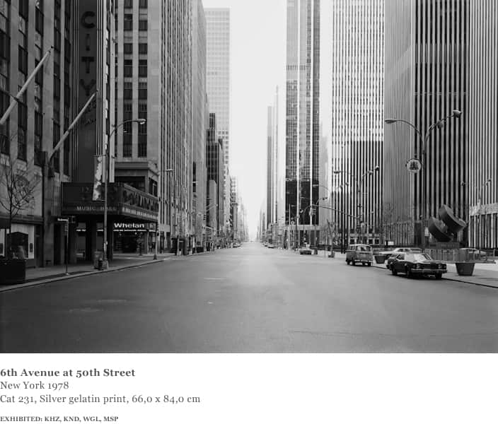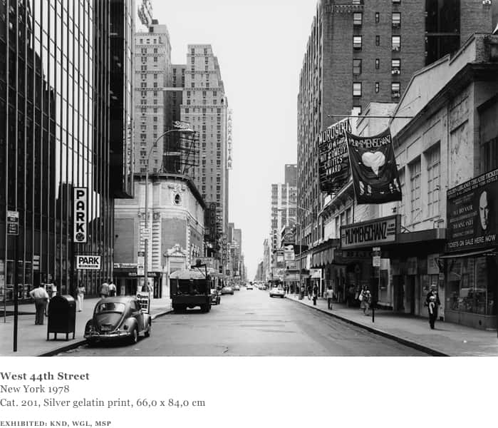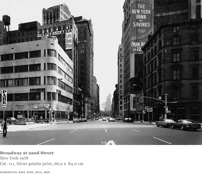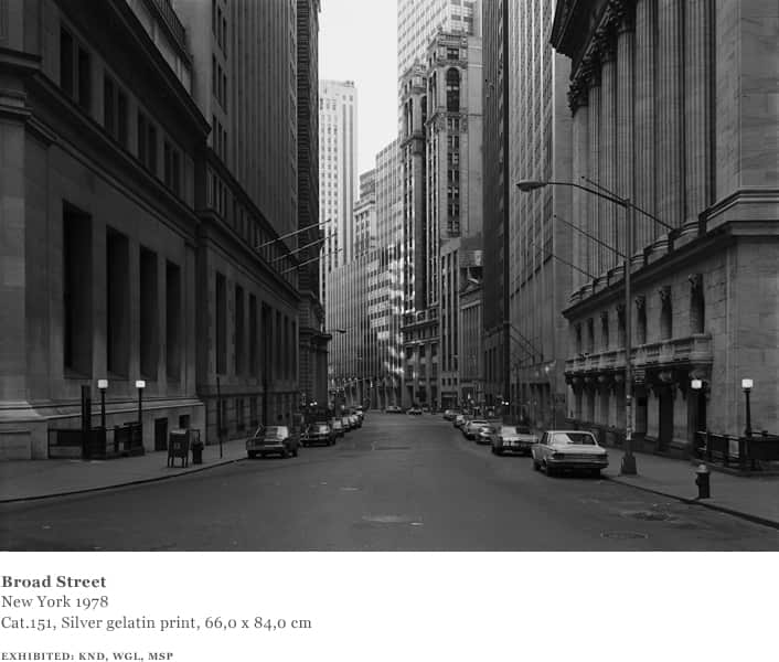 The scholarship in New York offered an opportunity to concentrate intensively on photographing the streets of a different city. Over the course of several months, Struth photographed in various districts in Manhattan including Wall Street, Tribeca, SoHo, Chelsea, Midtown, Harlem as well as in Brooklyn, Queens and elsewhere, making two hundred black-and-white street photographs, invariably with a central perspective.