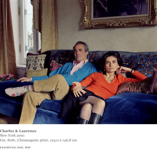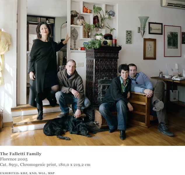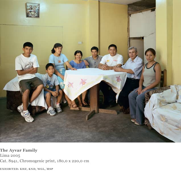As in earlier family photographs, the interiors often integrate other pictures on the walls behind the sitting family— for example, the religious reproduction hanging on the wall above The Ayvar Family, Peru (2005); the paintings of a skull and a head of a young woman in The Richter Family 1, Cologne (2002); the Caillebotte painting in Untitled, New York (2001); or the large colour map of the world in The Felsenfeld/Gold Families, Philadelphia (2007).