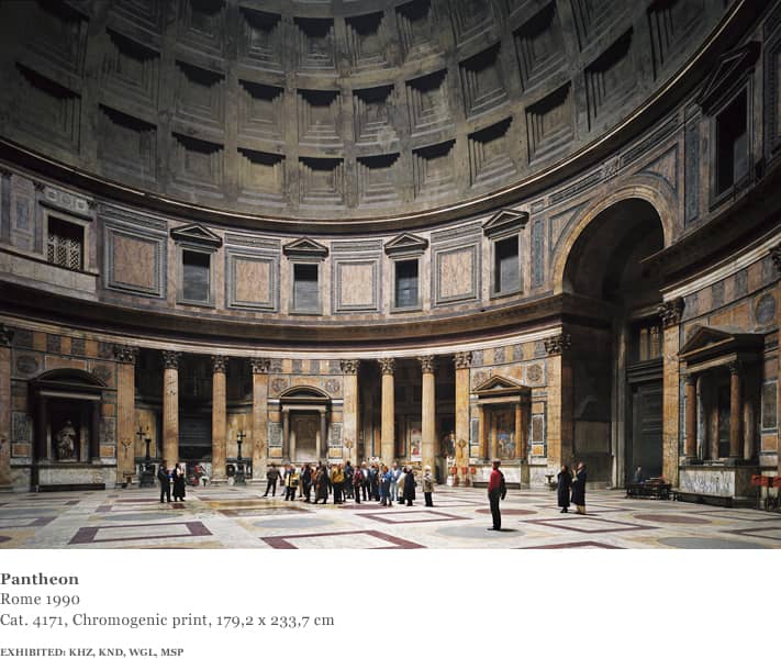 With the exception of a photograph from the Rijksmuseum with a friend of Struth’s sitting in front of a Rembrandt group portrait, the Museum Photographs were not staged. Struth preferred to observe and wait patiently for the work to form itself through the right configuration of people and pictures within the frame he had established in the gallery. Diverging from this working method was necessary for a work Struth wanted to make in the interior of the Pantheon in Rome. Struth first made a black-and-white picture in the Pantheon but the continuous movement of people and the limited light made it impossible to obtain a result.