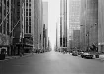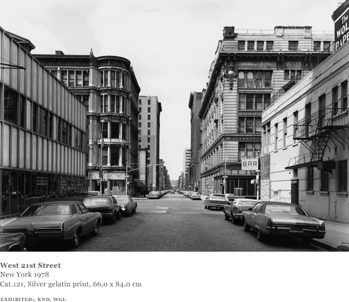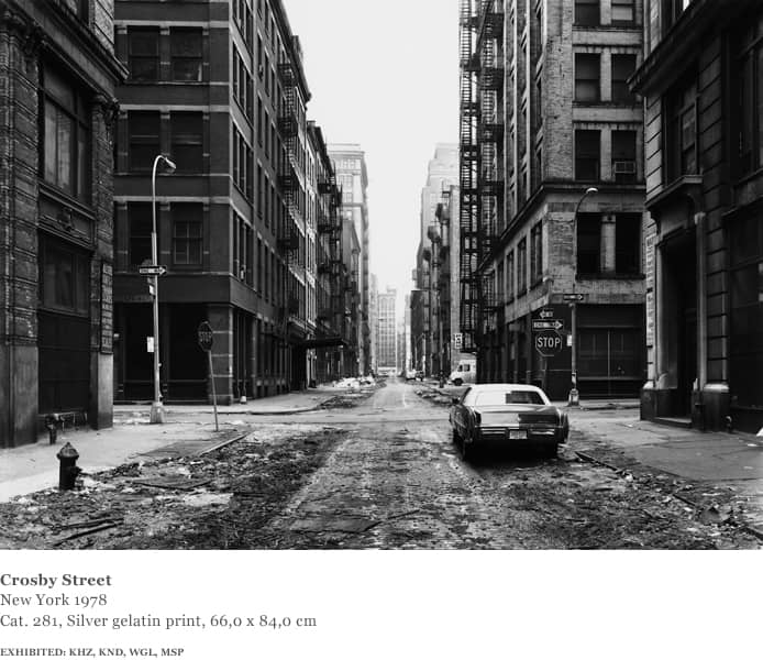 The scholarship in New York offered an opportunity to concentrate intensively on photographing the streets of a different city. Over the course of several months, Struth photographed in various districts in Manhattan including Wall Street, Tribeca, SoHo, Chelsea, Midtown, Harlem as well as in Brooklyn, Queens and elsewhere, making two hundred black-and-white street photographs, invariably with a central perspective.